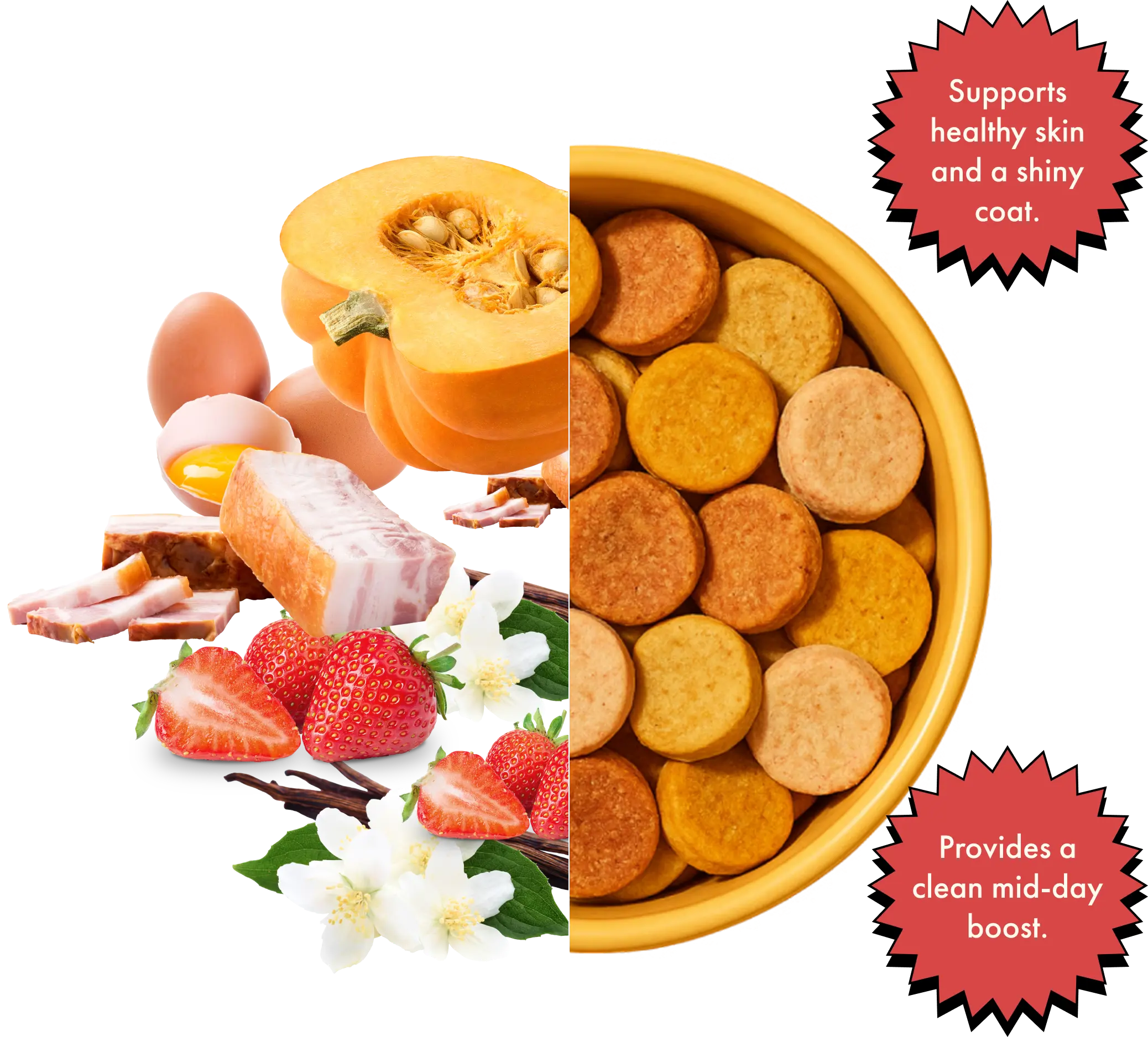 When the afternoon yawns hit, bring on the cheer. Made with real strawberries, creamy vanilla, and gut-friendly oats, this midday snack is light, wholesome, and tail-wag delicious. Keeps your pup’s energy steady without fillers or artificial junk, just sunshine in every bite.